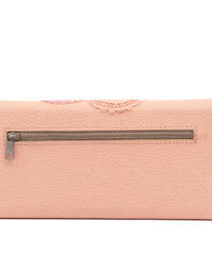 Billetera para dama de cuero salmón con compartimiento doble y ñandutí artesanal, práctica, elegante y resistente