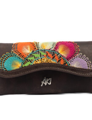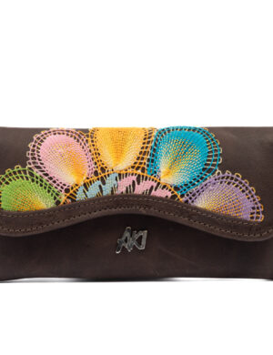 Billetera para dama de cuero marrón con compartimiento simple y ñandutí artesanal, práctica, elegante y resistente.