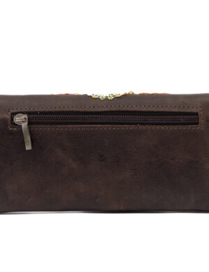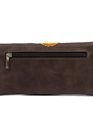 Billetera con doble compartimiento en cuero genuino color marron japones, con detalle de ñanduti.