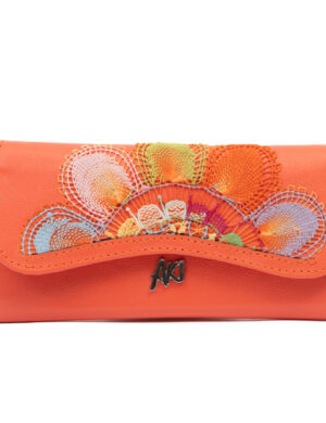 Billetera para dama de cuero naranja con compartimiento simple y ñandutí artesanal, práctica, elegante y resistente.