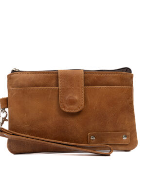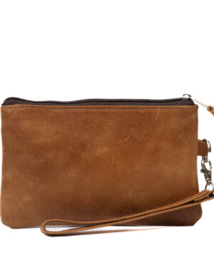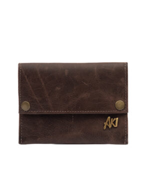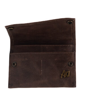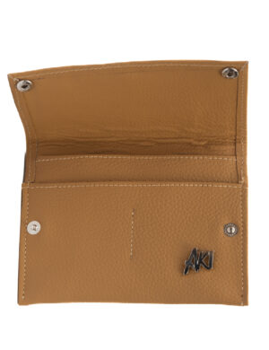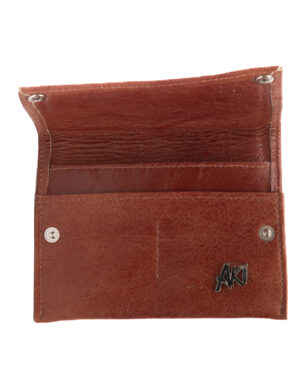 Porta pasaportes marrón suela con cierre y broche, práctico, seguro y resistente.