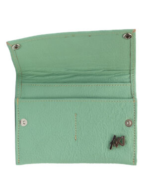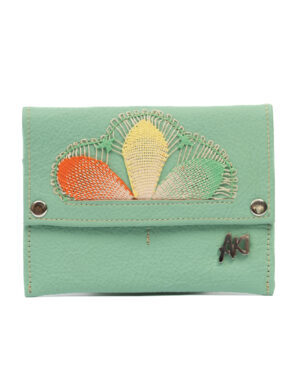 Porta pasaporte de cuero verde agua con detalle artesanal de ñandutí, elegante, resistente y funcional. Ideal para viajar, protege tu pasaporte con estilo.