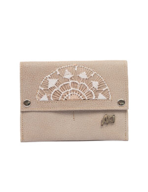 Porta pasaporte de cuero beige claro con detalle artesanal de ñandutí