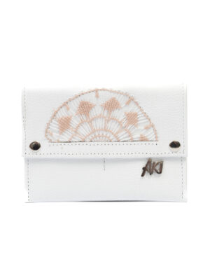 Porta pasaporte de cuero blanco con detalle artesanal de ñandutí, elegante, resistente y funcional. Ideal para viajar, protege tu pasaporte con estilo.