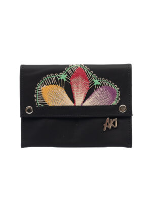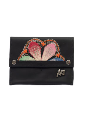 Porta pasaporte de cuero negro con detalle artesanal de ñandutí, elegante, resistente y funcional. Ideal para viajar, protege tu pasaporte con estilo.