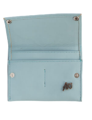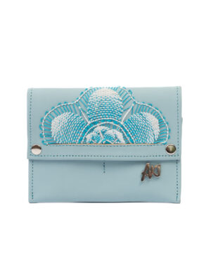Porta pasaporte de cuero celeste con detalle artesanal de ñandutí, elegante, resistente y funcional. Ideal para viajar, protege tu pasaporte con estilo.