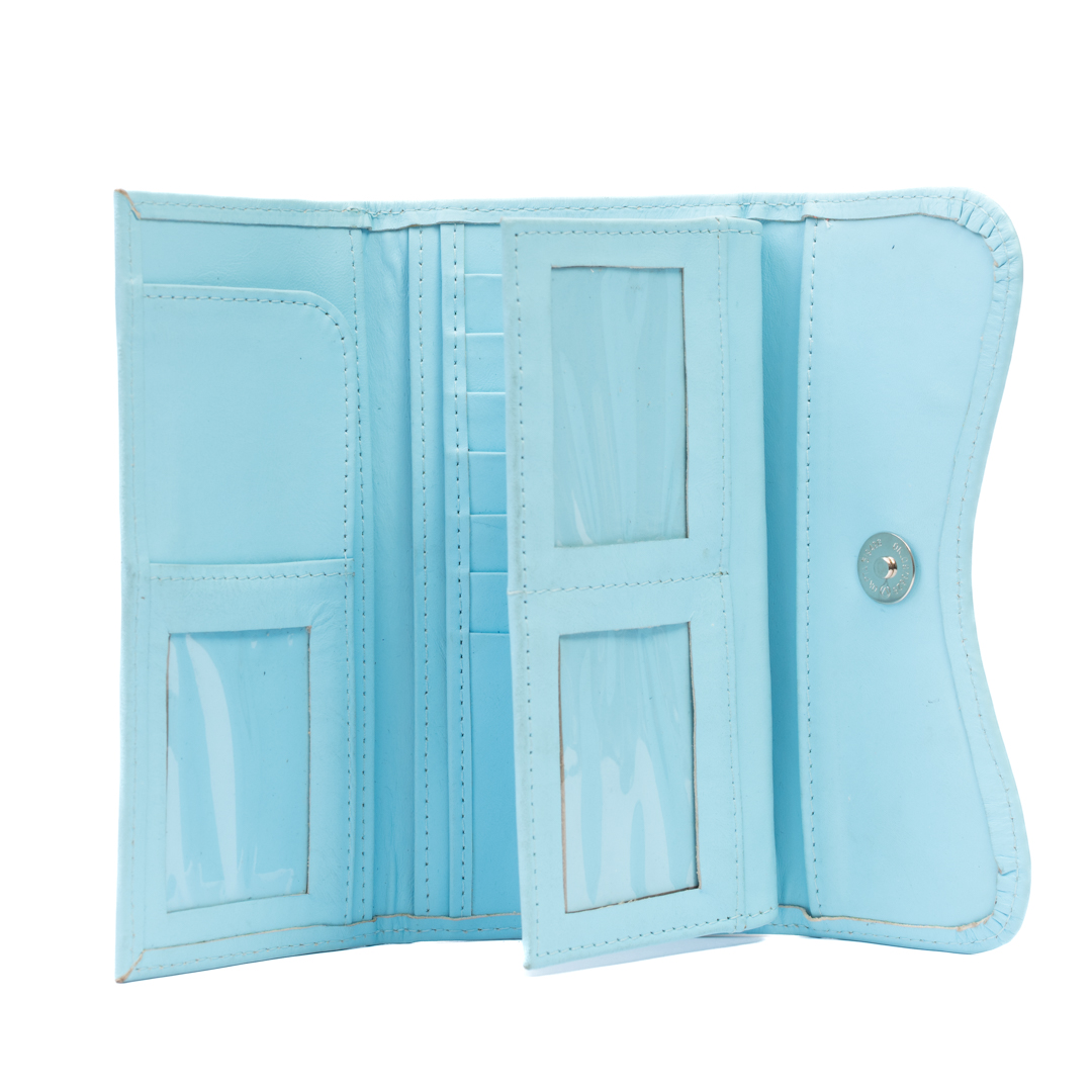 Billetera para dama de cuero celeste con compartimiento doble, funcional, elegante y resistente.
