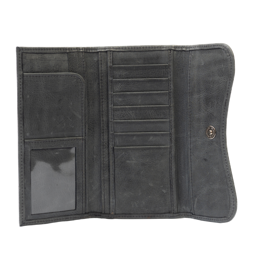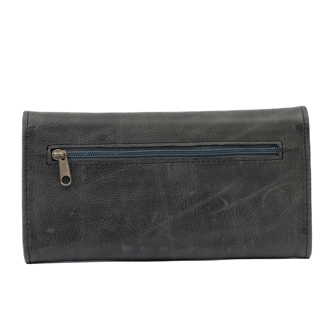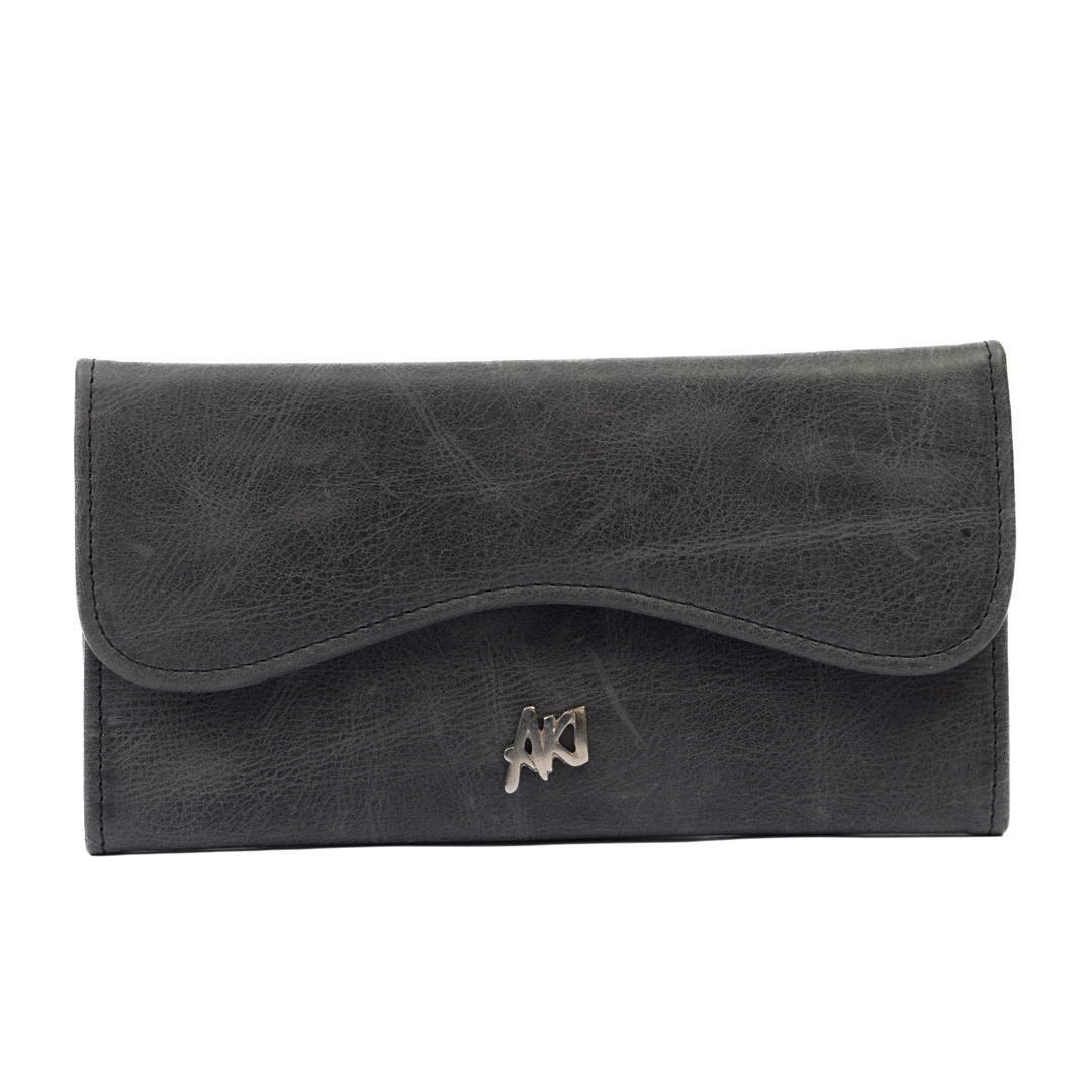 Billetera para dama de cuero gris oscuro con compartimiento simple, funcional, elegante y resistente.