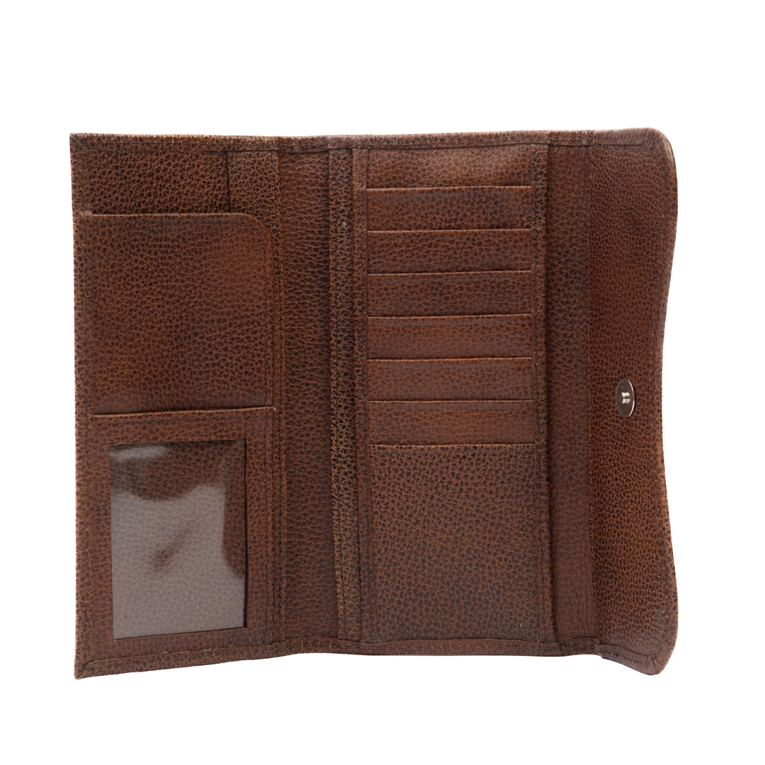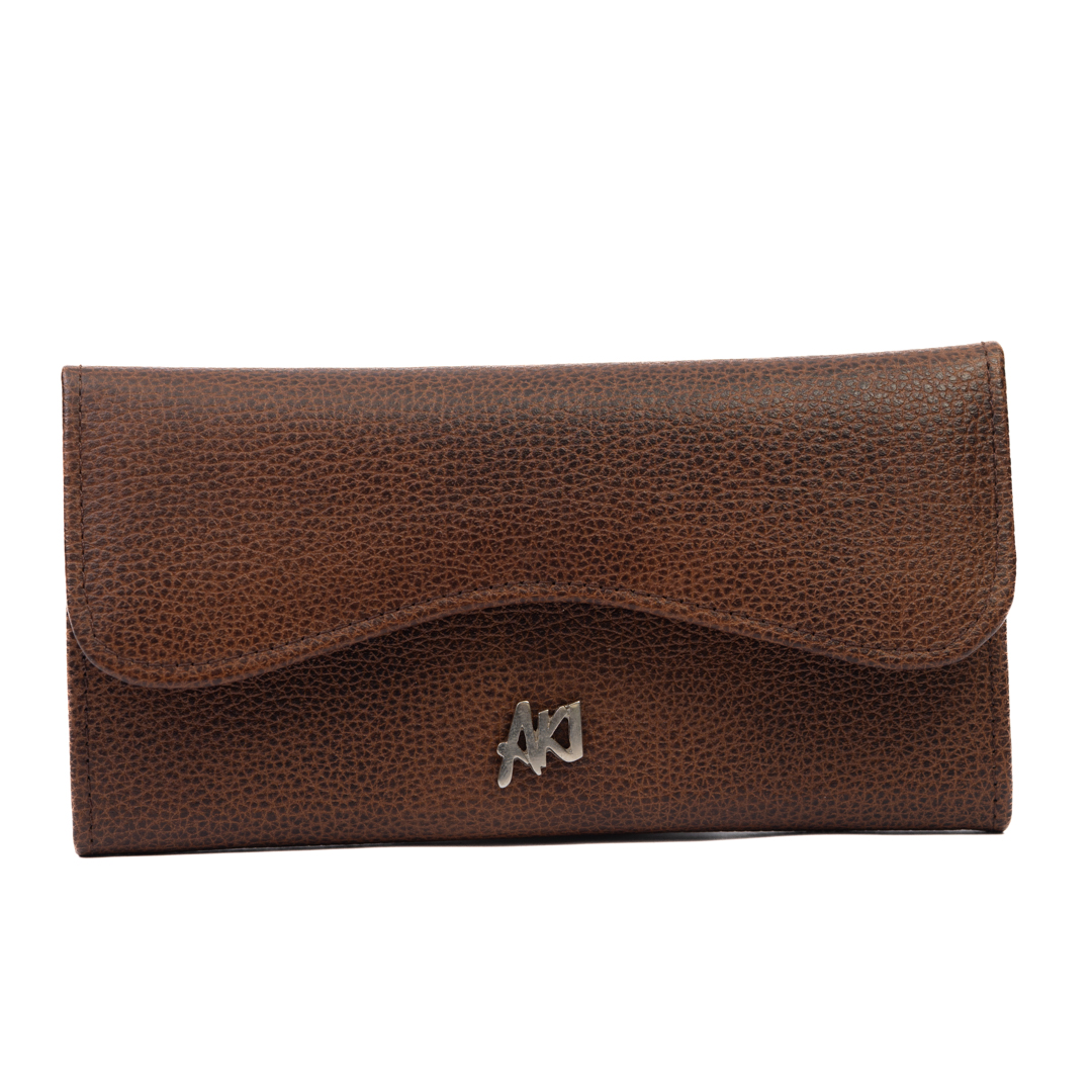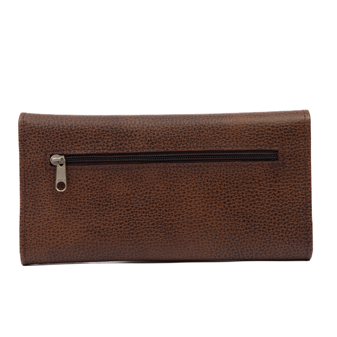 Billetera para dama de cuero marrón con compartimiento simple, funcional, elegante y resistente.