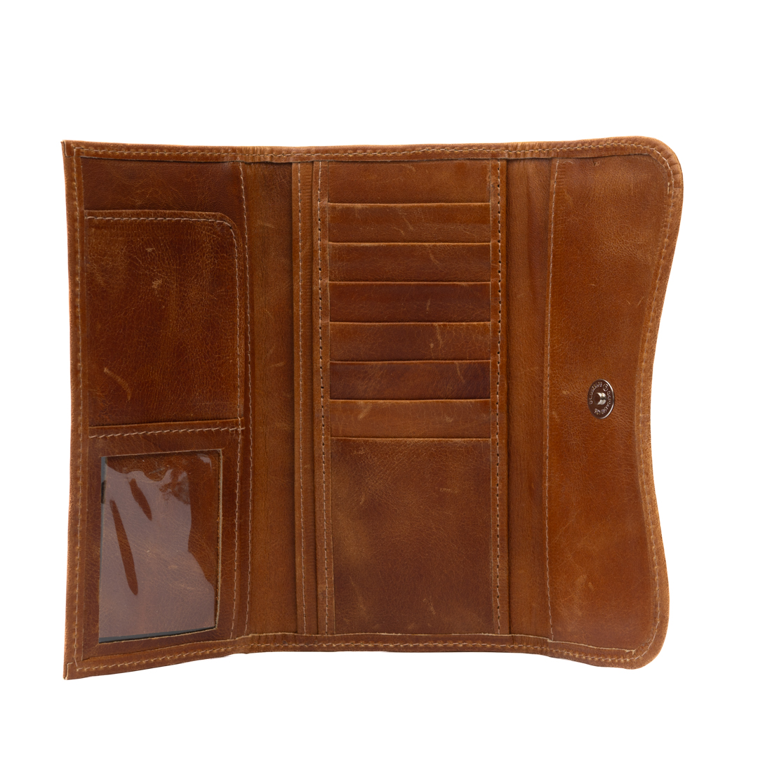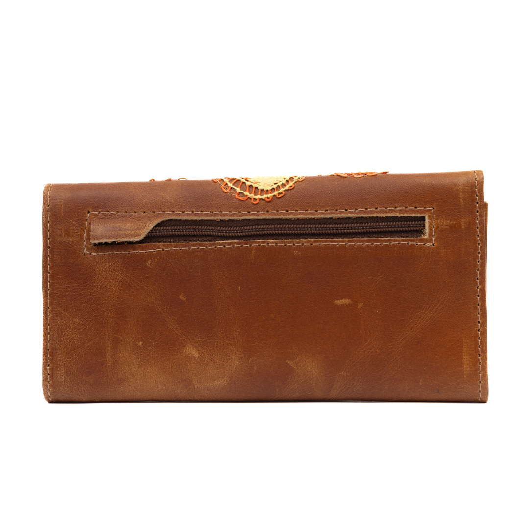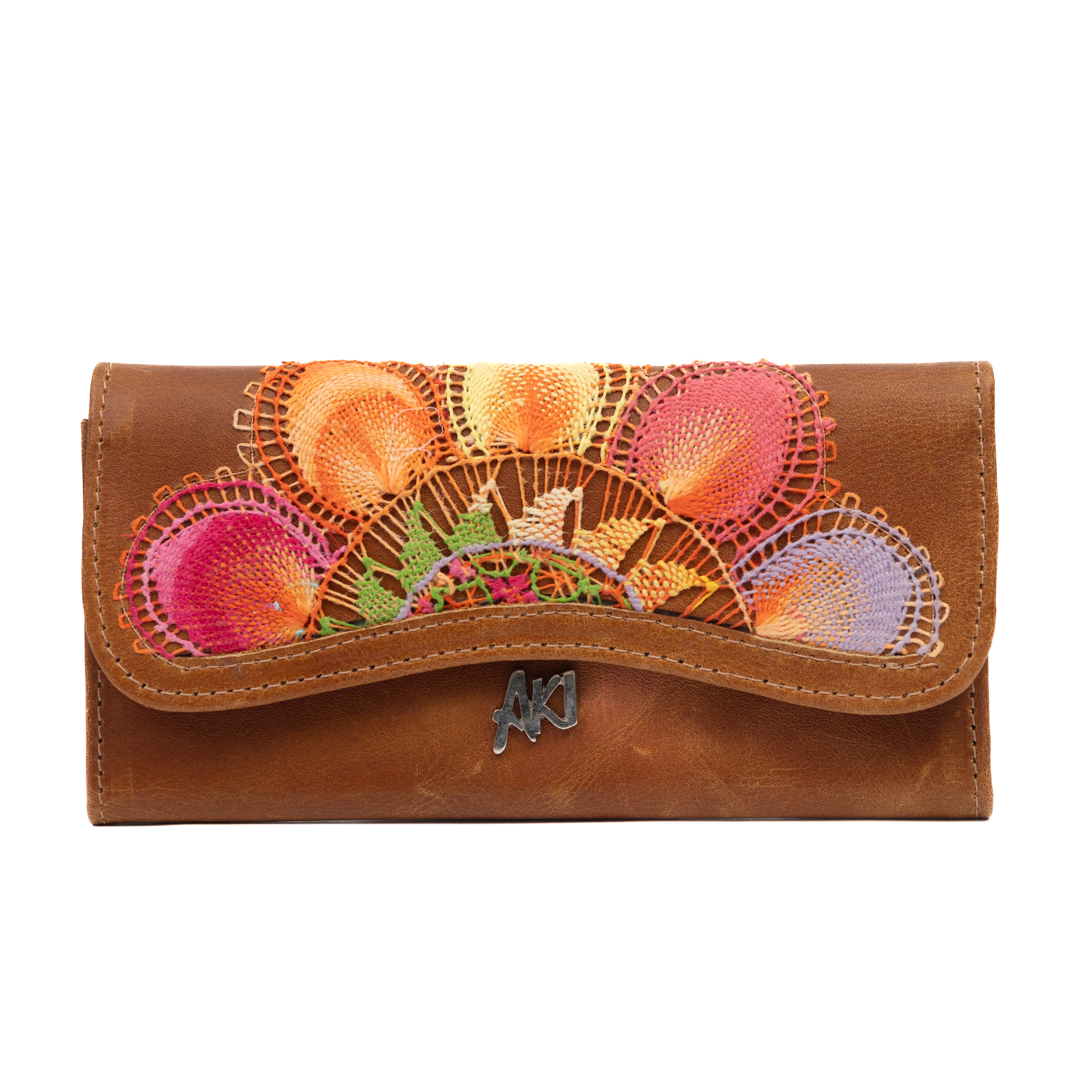 Billetera para dama de cuero marrón suela con compartimiento simple con detalle artesanal de ñandutí