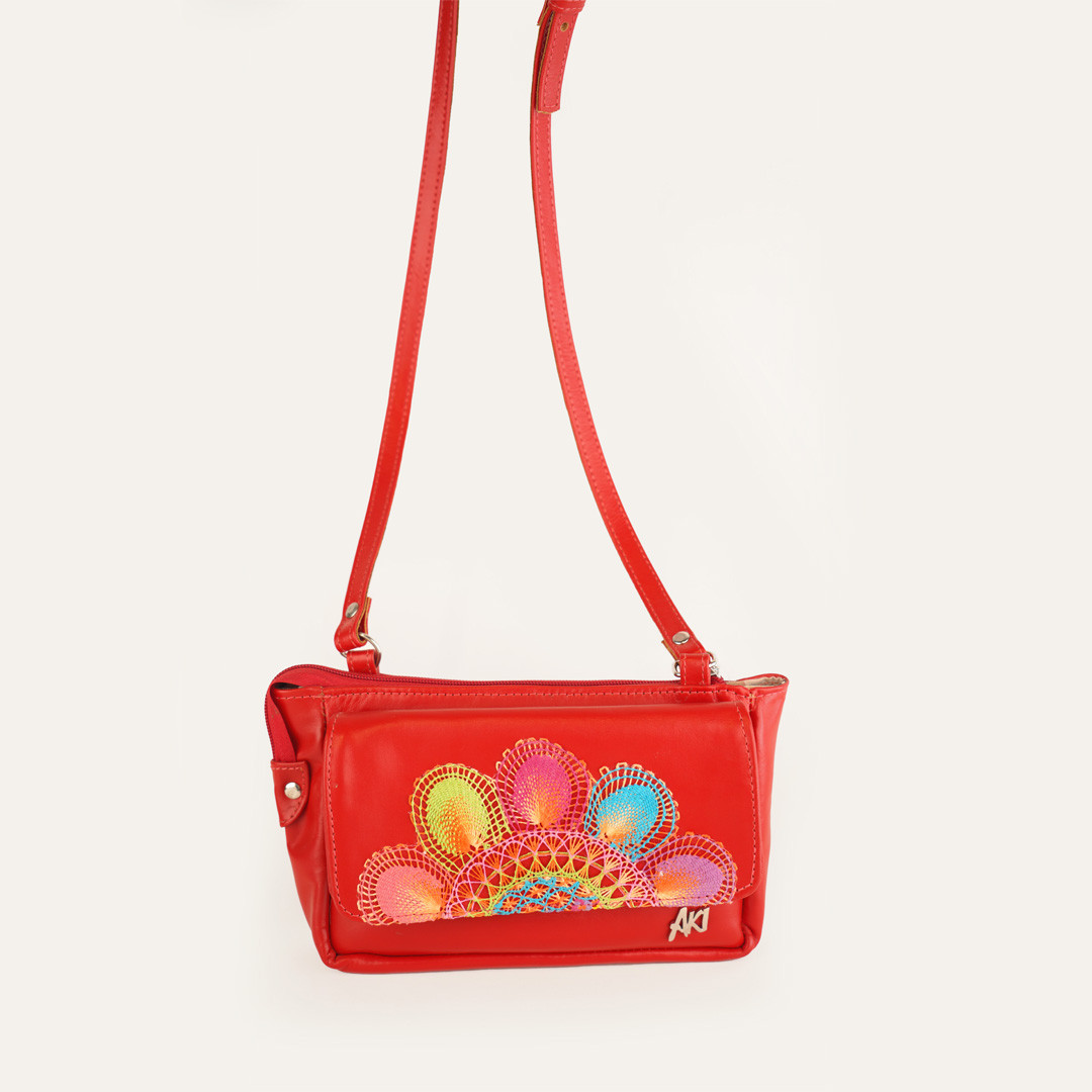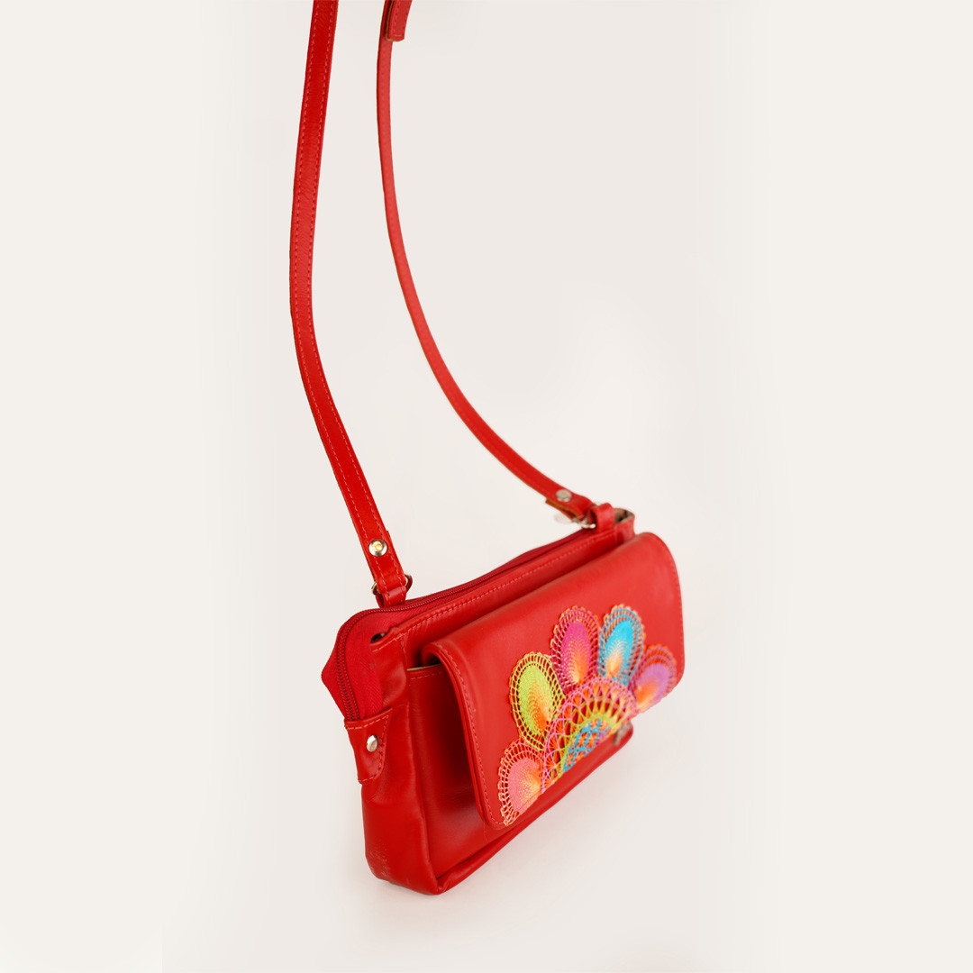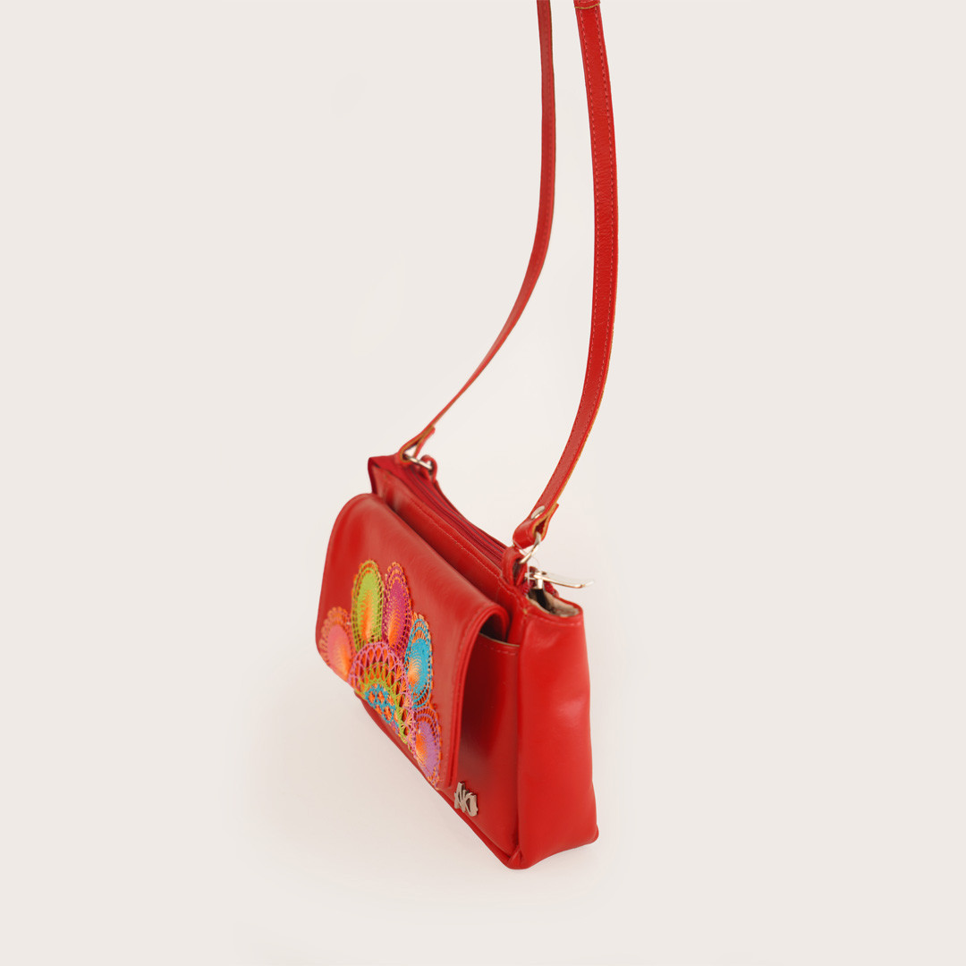 Carterita jime en cuero genuino color rojo, con detalle de ñanduti. Especial para los paseos en donde solo necesitas llevar lo escencial.
