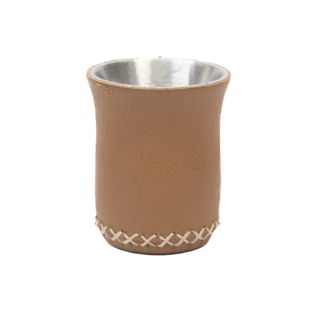 Guampa de mate de aluminio y madera forrada en cuero beige oscuro. Artesanal, resistente y elegante, hecha en Paraguay. Ideal para uso diario y regalos premium.