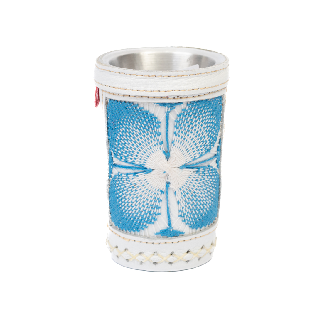 Guampa de Tereré de aluminio y madera forrada en cuero blanco con aplique de ñandutí