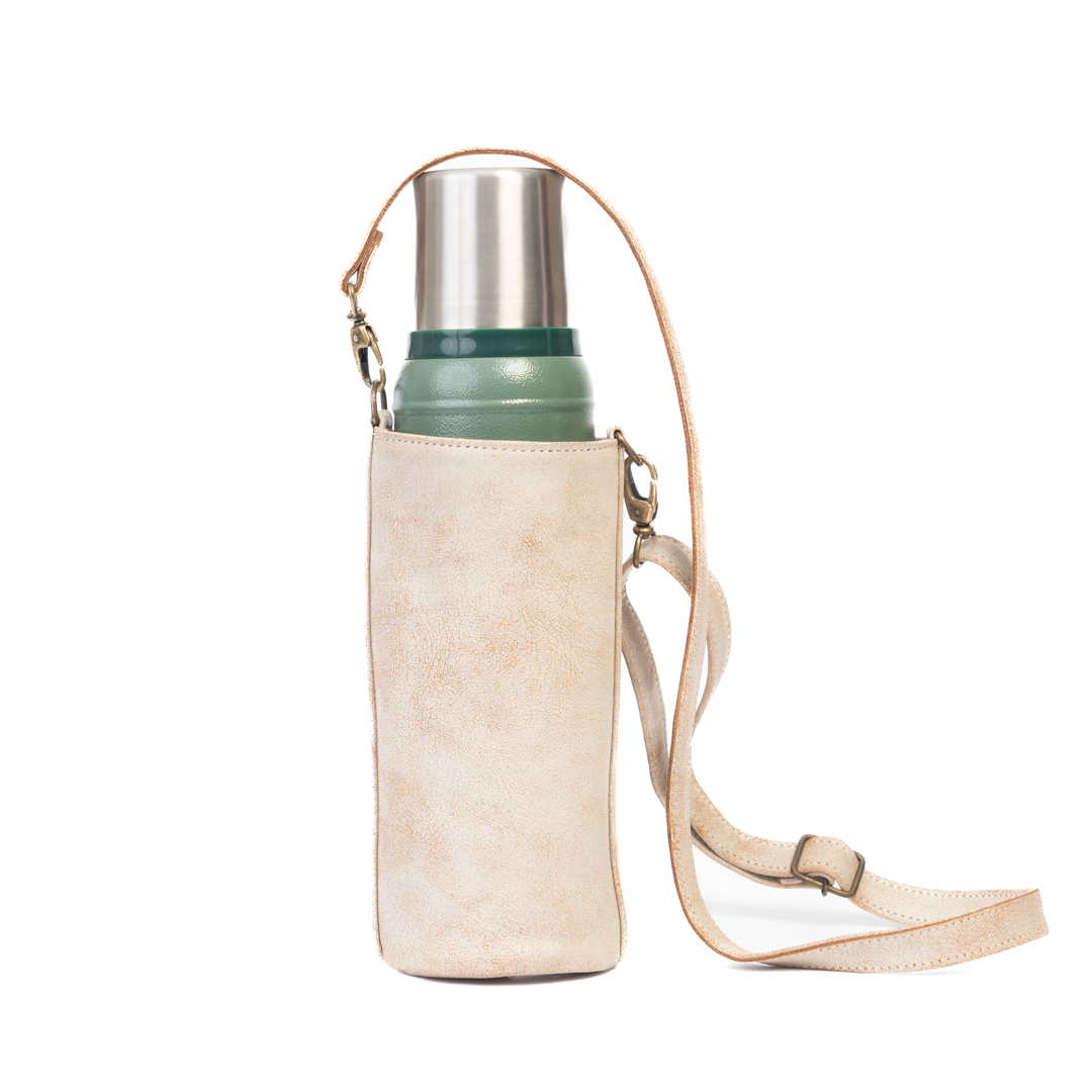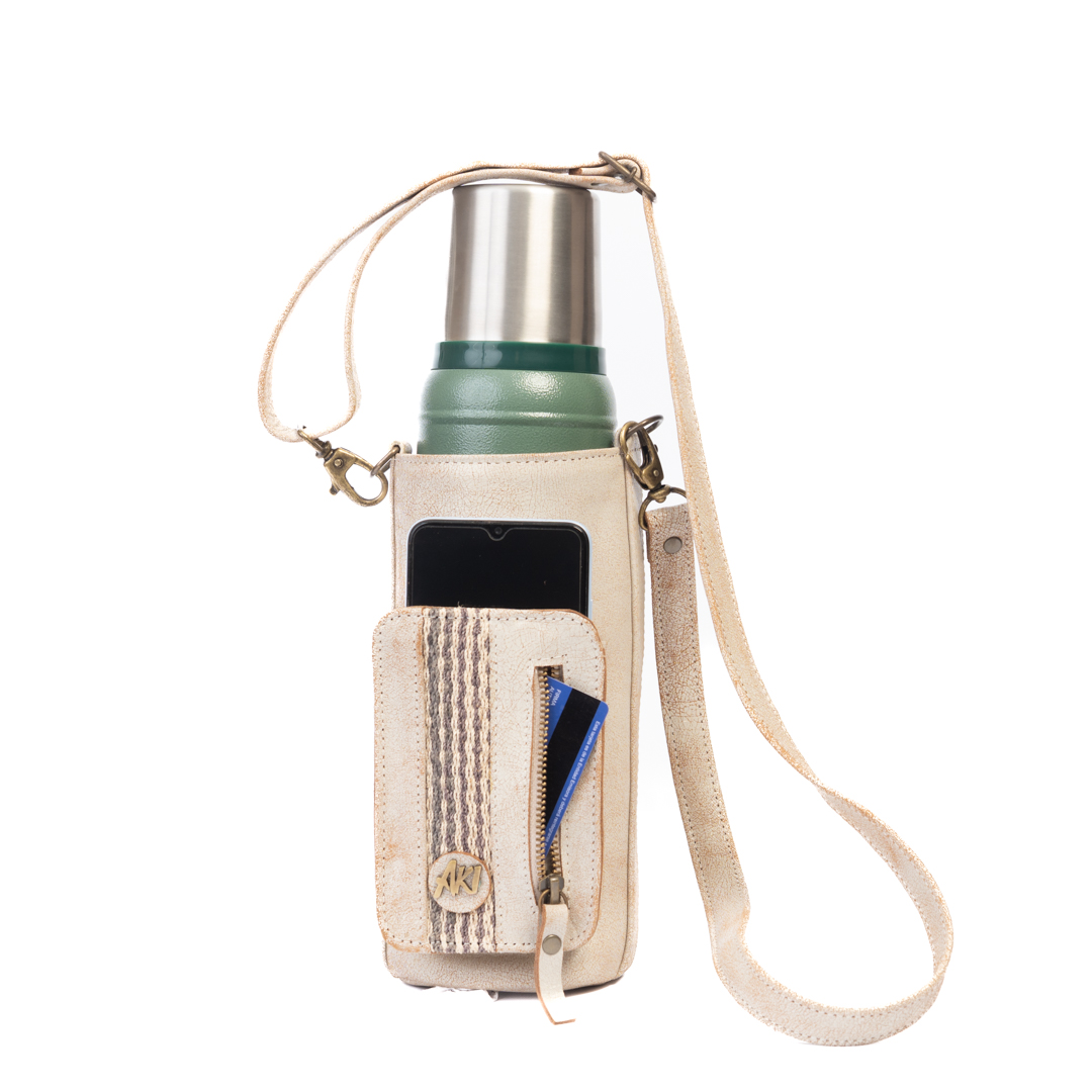 Porta hoppie/termo de cuero beige con correa ajustable y detalle artesanal de karaguata