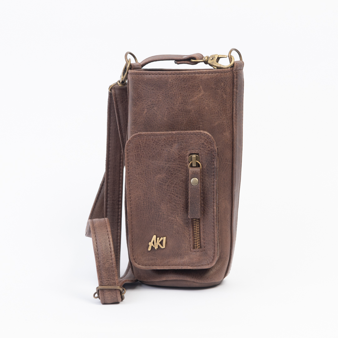 Porta hoppie/termo de cuero marrón gastado con correa ajustable, compartimientos útiles y estilo funcional.