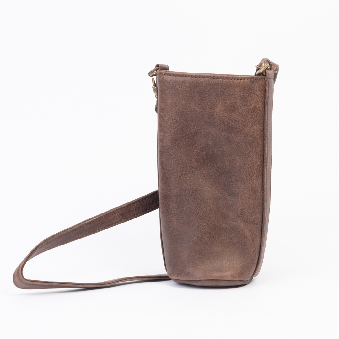 Porta hoppie/termo de cuero marrón gastado con correa ajustable sin detalle artesanal