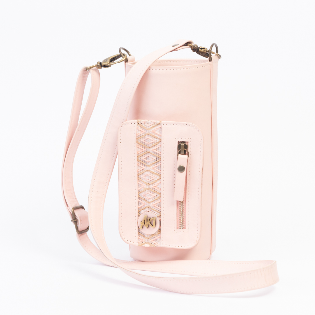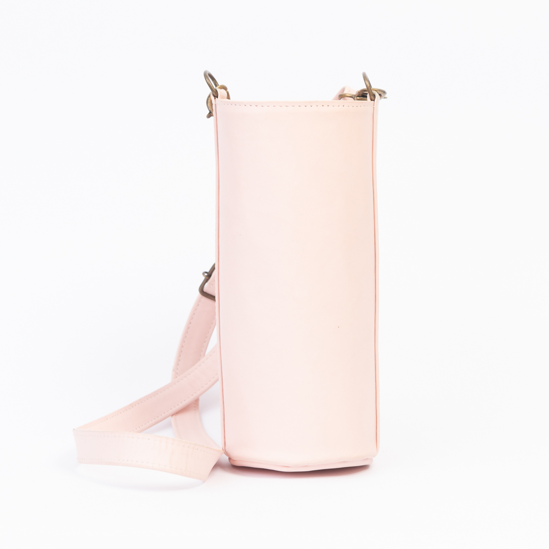 Porta hoppie/termo de cuero rosado claro con correa ajustable, compartimientos prácticos y detalle de ao po’i.