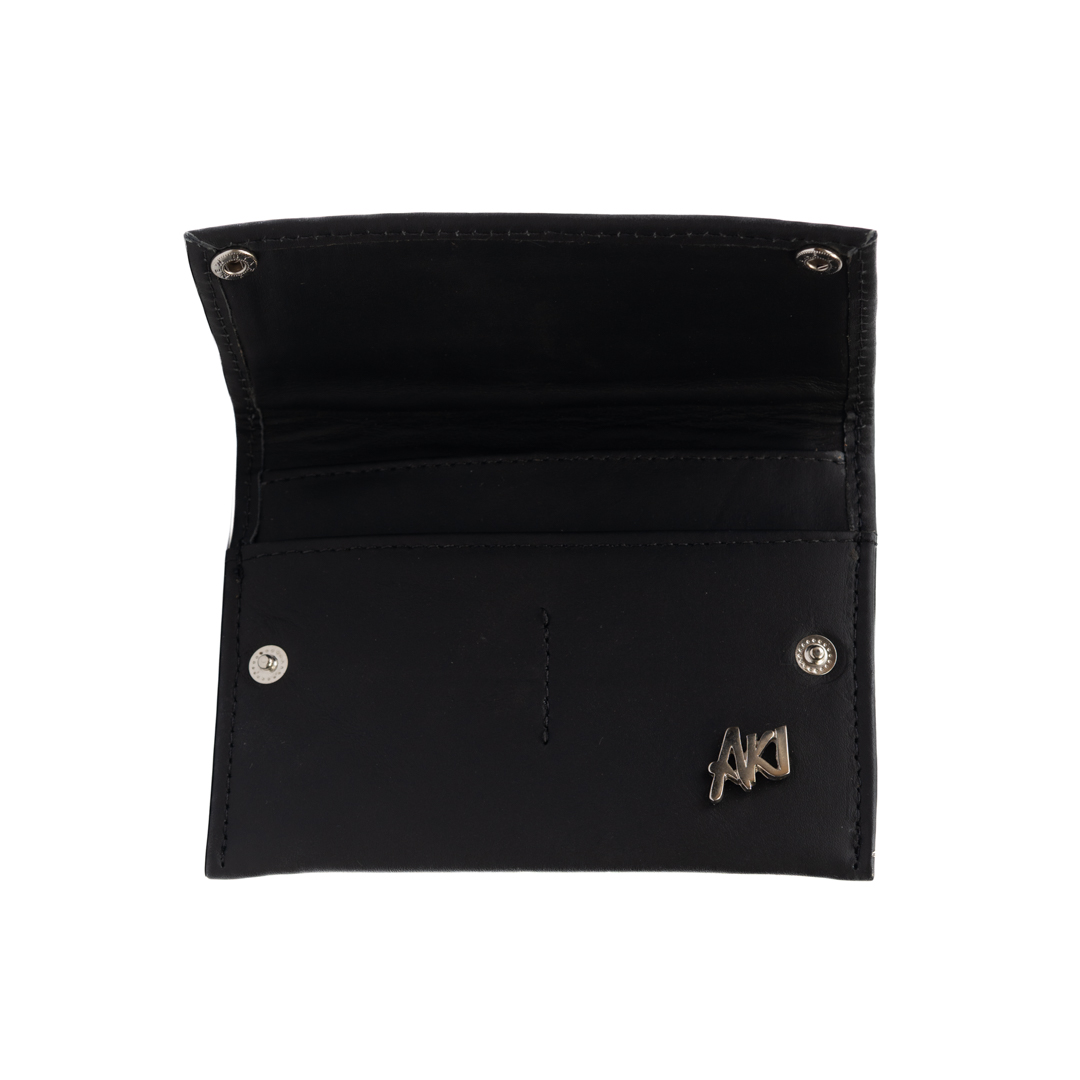 Porta pasaporte de cuero negro con detalle artesanal de faja