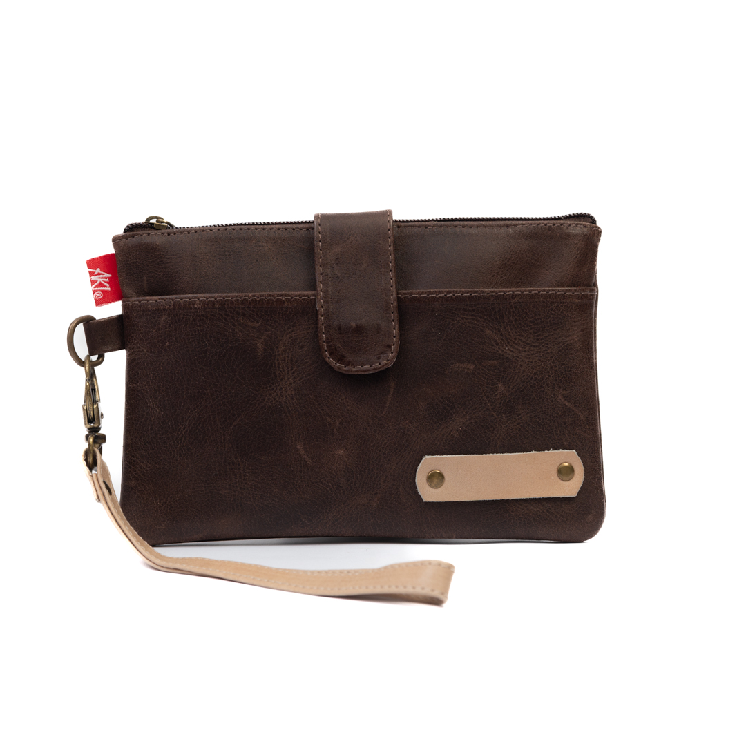 Porta pasaportes marrón y beige con cierre y broche, práctico, seguro y resistente.