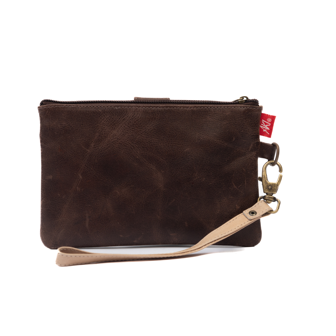 Porta pasaportes color marrón y beige con cierre y broche sin detalle artesanal