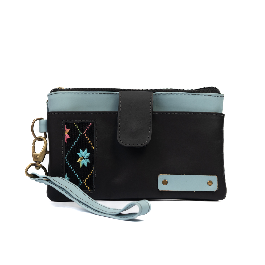 Porta pasaportes con cierre y broche, combinado en tonos negro y celeste, con detalle artesanal de ao po’i.