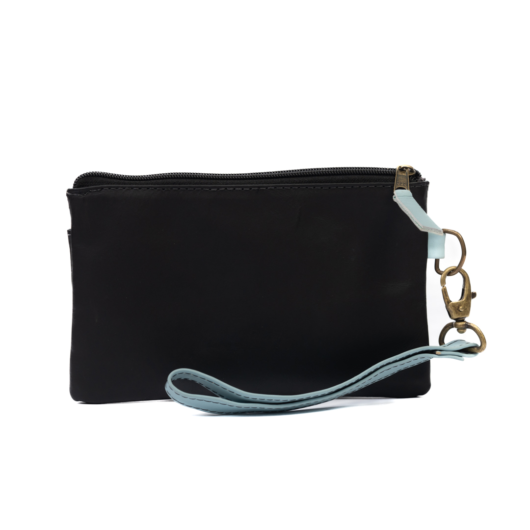 Porta pasaportes color negro y celeste con cierre y broche con detalle artesanal de ao po’i