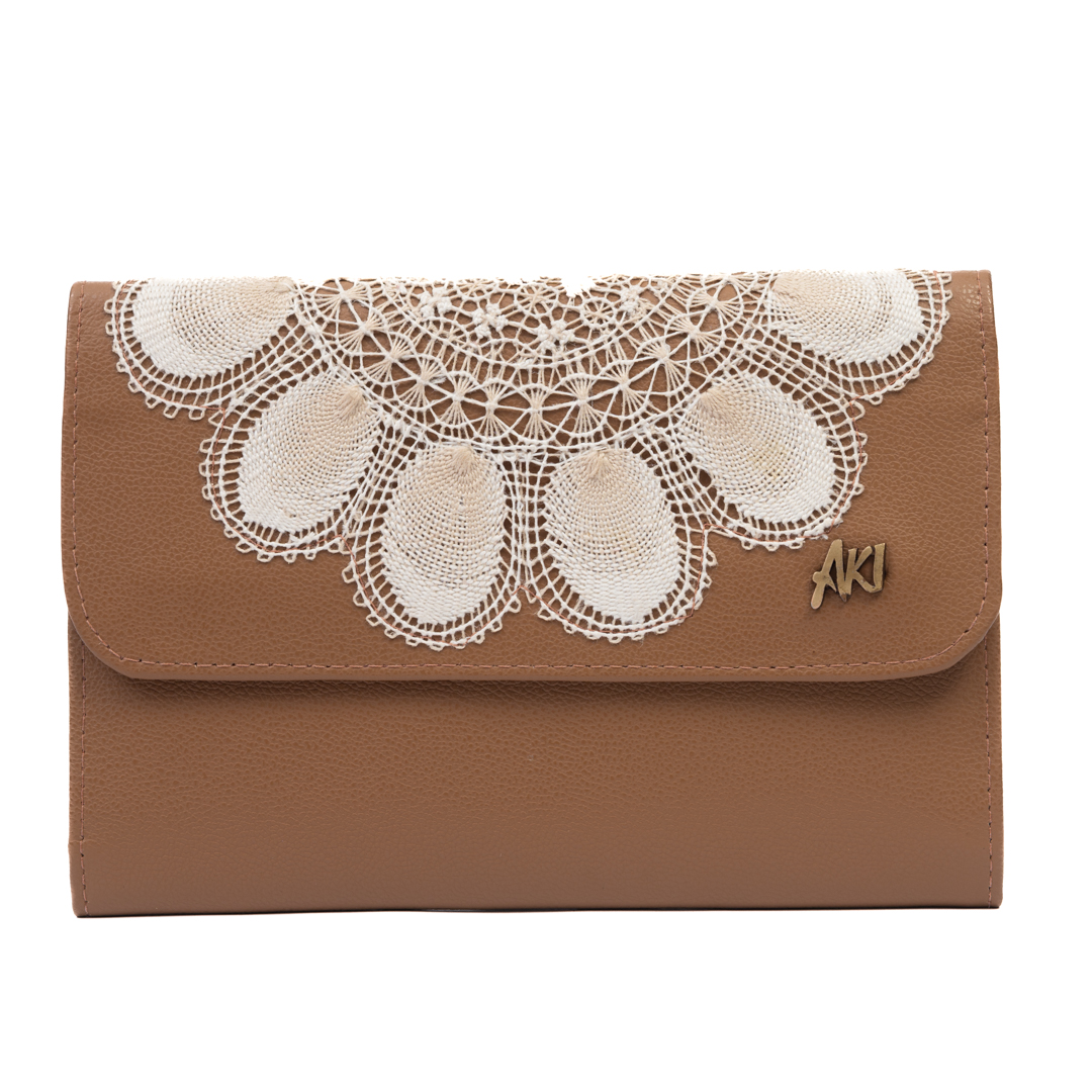 Porta pasaportes familiar para 4 de cuero beige con detalle de ñandutí, práctico y funcional.
