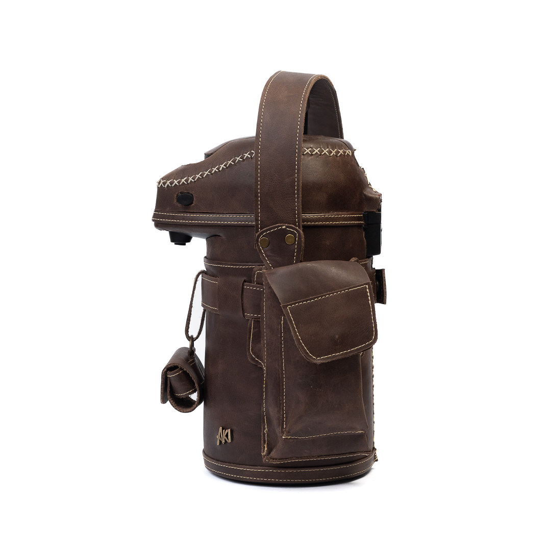 Termo Inox 1.9 L especial para tereré o mate, forrado completo en cuero marrón. Incluye bolsillos y porta accesorios. Diseño resistente y elegante y hecho a mano en Paraguay. Ideal para uso diario y regalos premium.