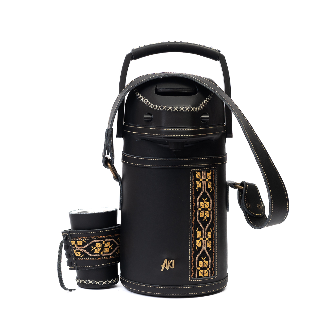 Termo Inox 1.9 L Tereré o Mate forrado completo en cuero negro con Ao Poi