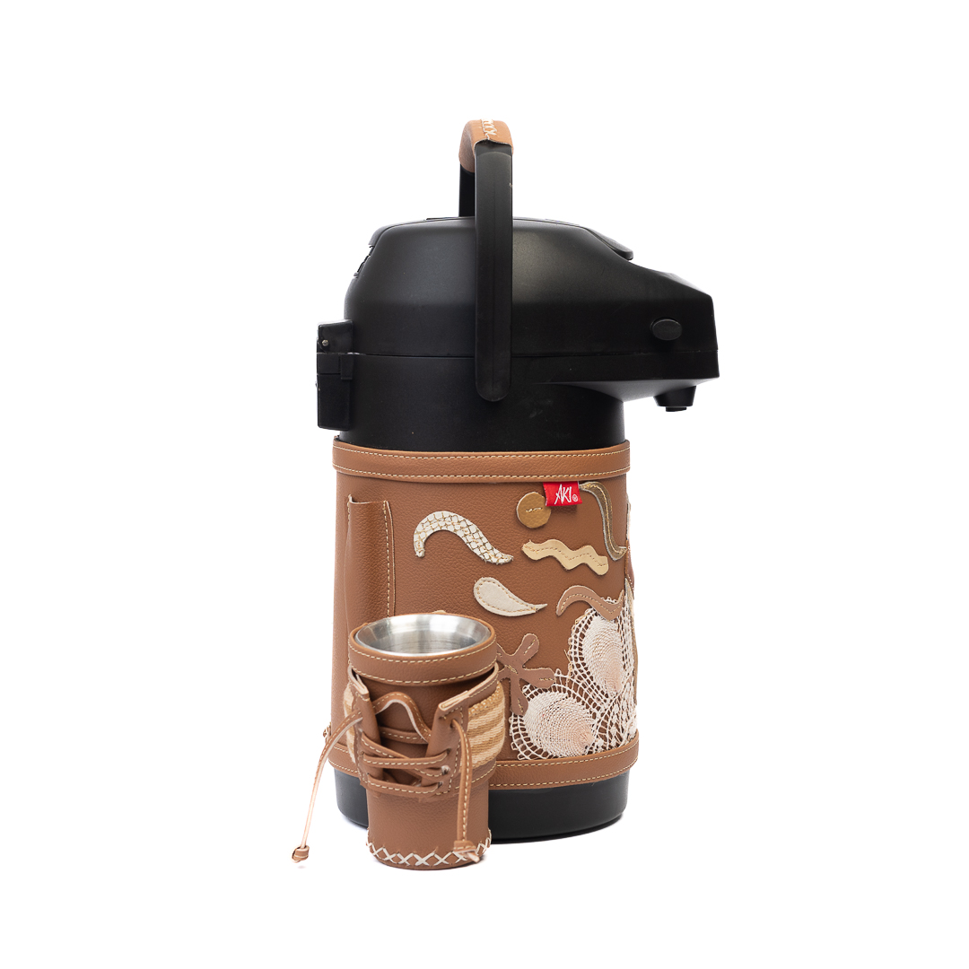 Termo de acero inoxidable 1,9 litros para tereré o mate, forrado en simil-cuero genuino con detalles de artesanía del Paraguay.