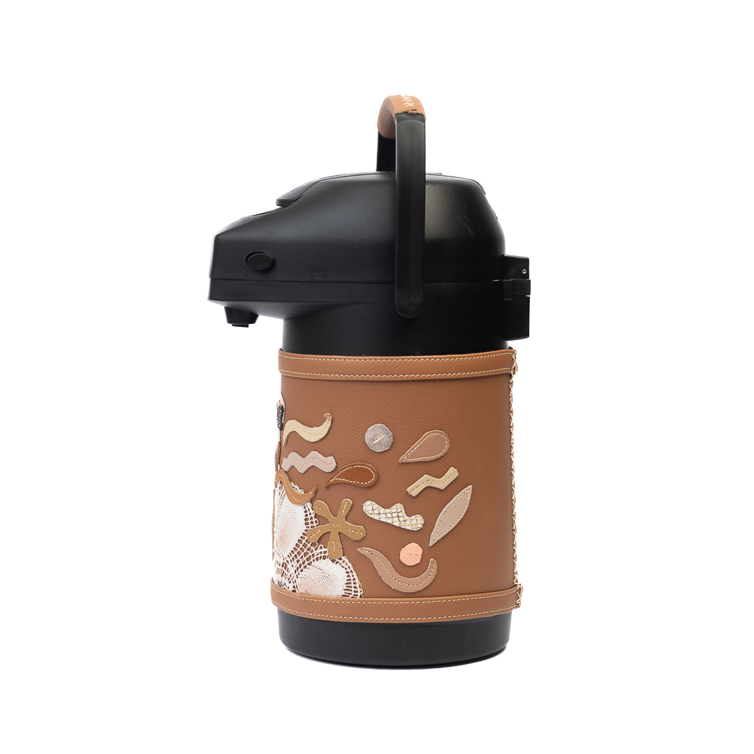 Termo Inox 1.9 L especial para tereré o mate, forrado en simil-cuero marrón claro. Incluye detalles de faja y arte. Diseño resistente y elegante y hecho a mano en Paraguay. Ideal para uso diario y regalos premium.