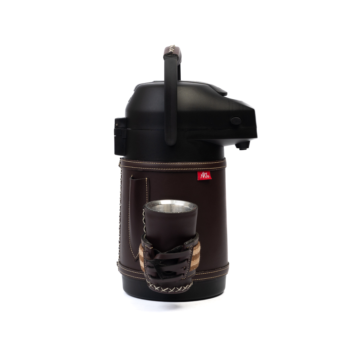 Termo Inox 1.9 L Tereré o Mate forrado en simil-cuero marrón oscuro con faja