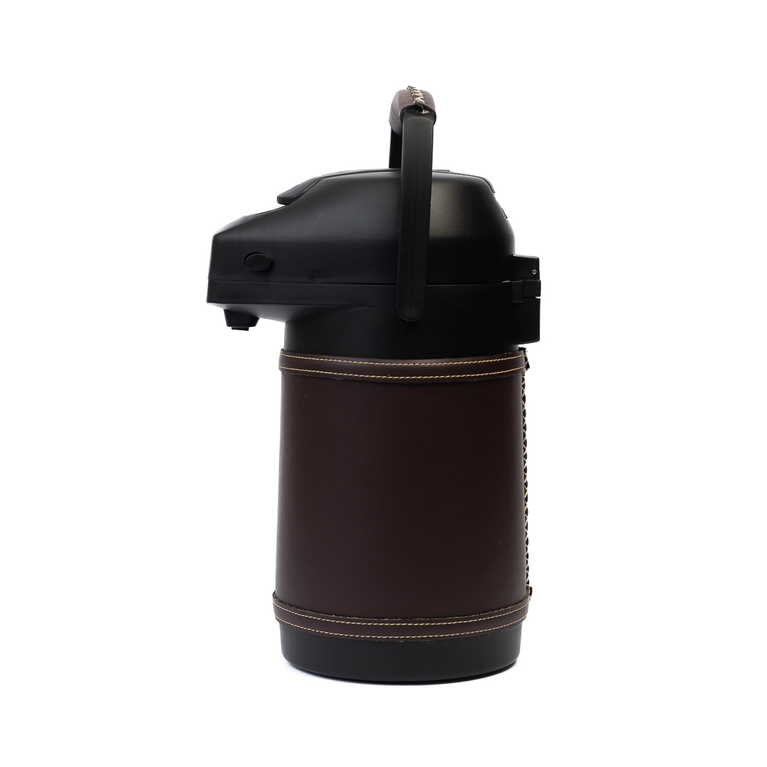 Termo Inox 1.9 L especial para tereré o mate, forrado en simil-cuero marrón oscuro. Incluye detalles de faja. Diseño resistente y elegante y hecho a mano en Paraguay. Ideal para uso diario y regalos premium.