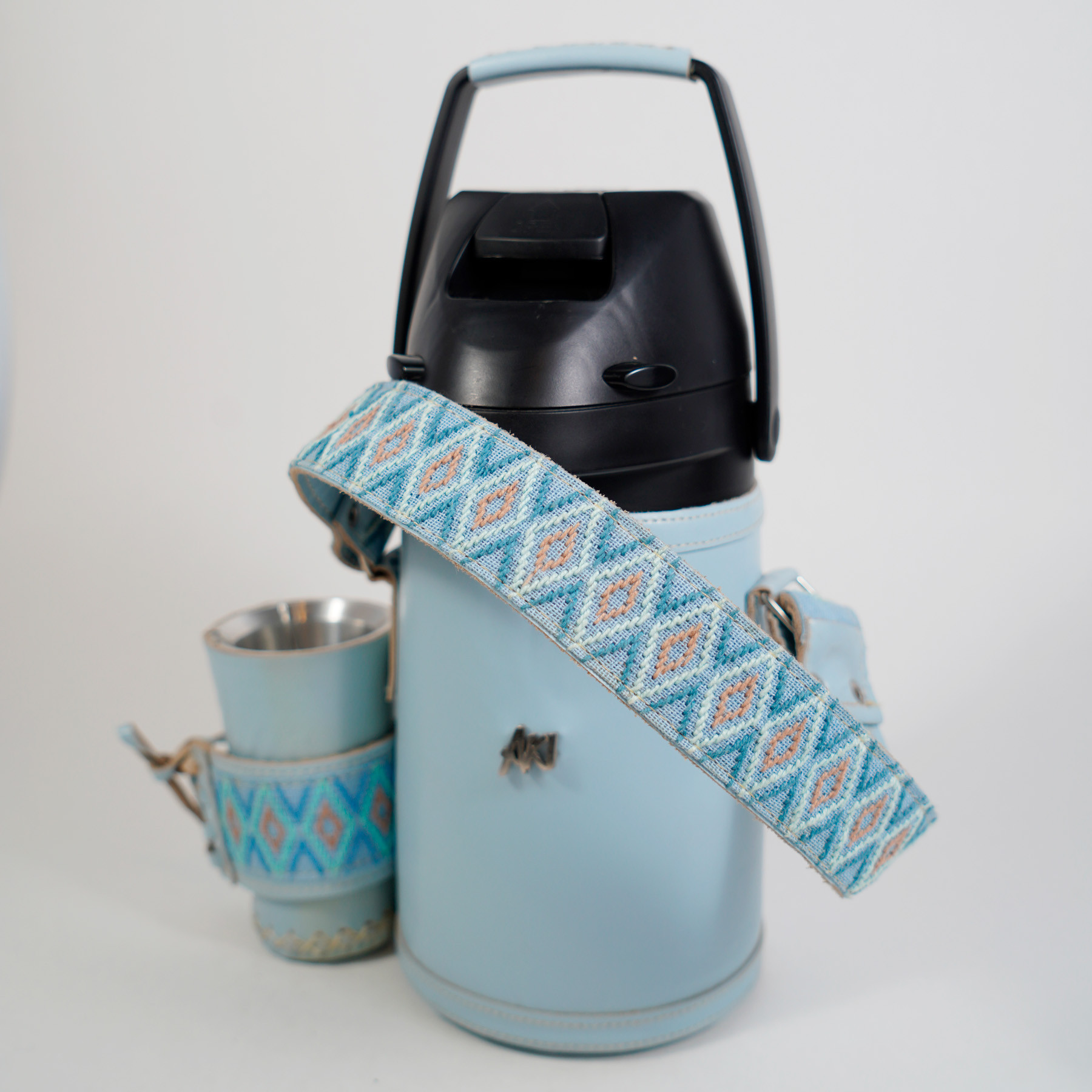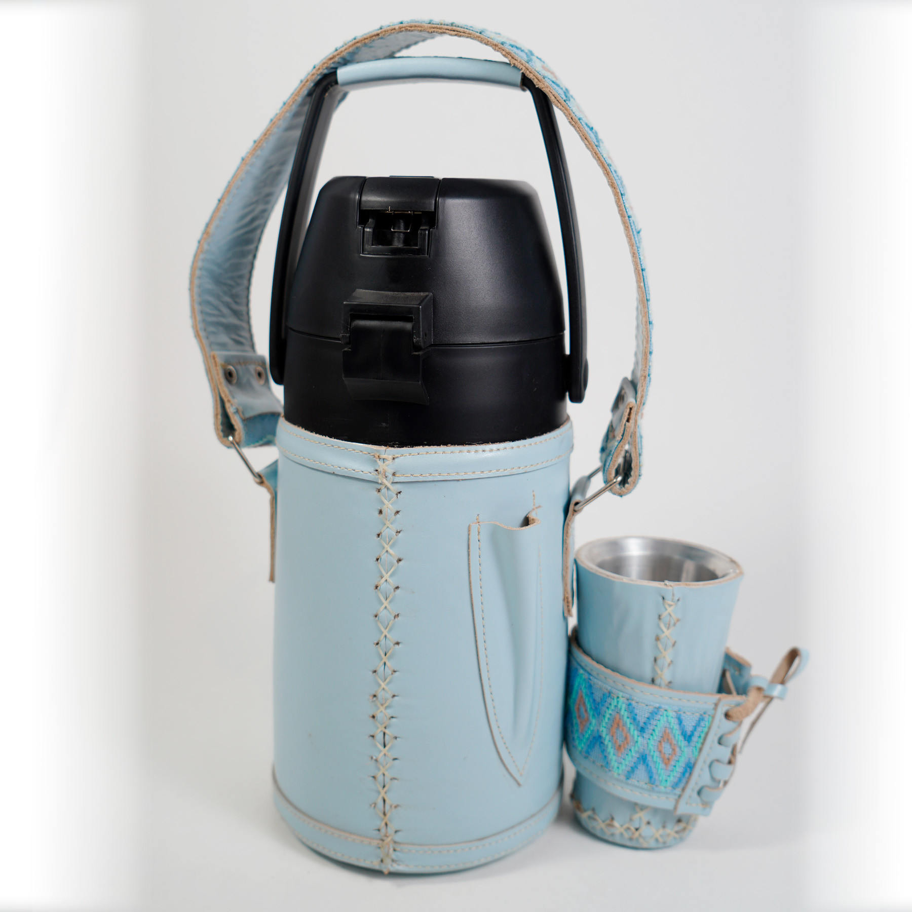 Termo de acero inoxidable forrado en cuero genuino textura lisa color celeste cielo con detalle de ao poi. Mantiene agua fria, con capacidad de 1.9 litros, incluye guampa forrada en cuero. El terere es una bebida refrescante tradicional de Paraguay. El Ao Poi significa tela fina o prenda delicada, elaborada por artesanos en la ciudad de Mauricio José Troche.
