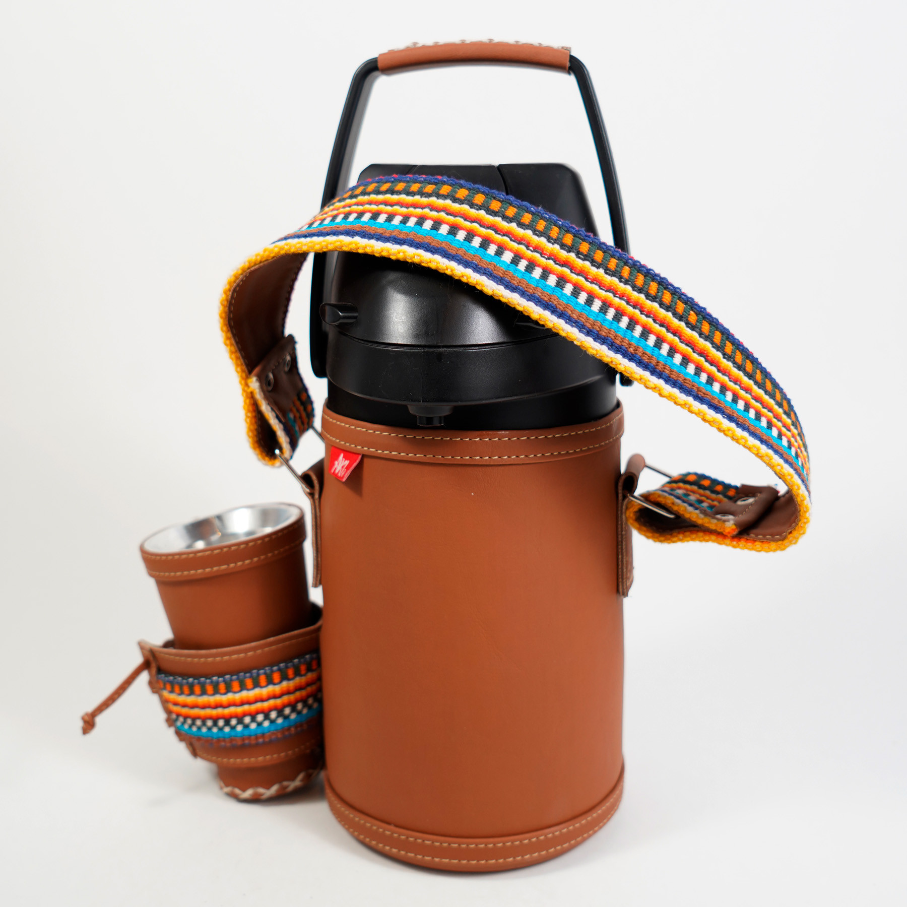 Termo de acero inoxidable forrado en simil cuero textura lisa color marron suela con detalle de faja. Mantiene agua fria y caliente, con capacidad de 1.3 litros, incluye guampa forrada en simil cuero. La faja es un tejido elaborado a mano por artesanos de Paraguay, mayormente e la ciudad de Carapegua y alrededores. El terere es una bebida refrescante tradicional de Paraguay.