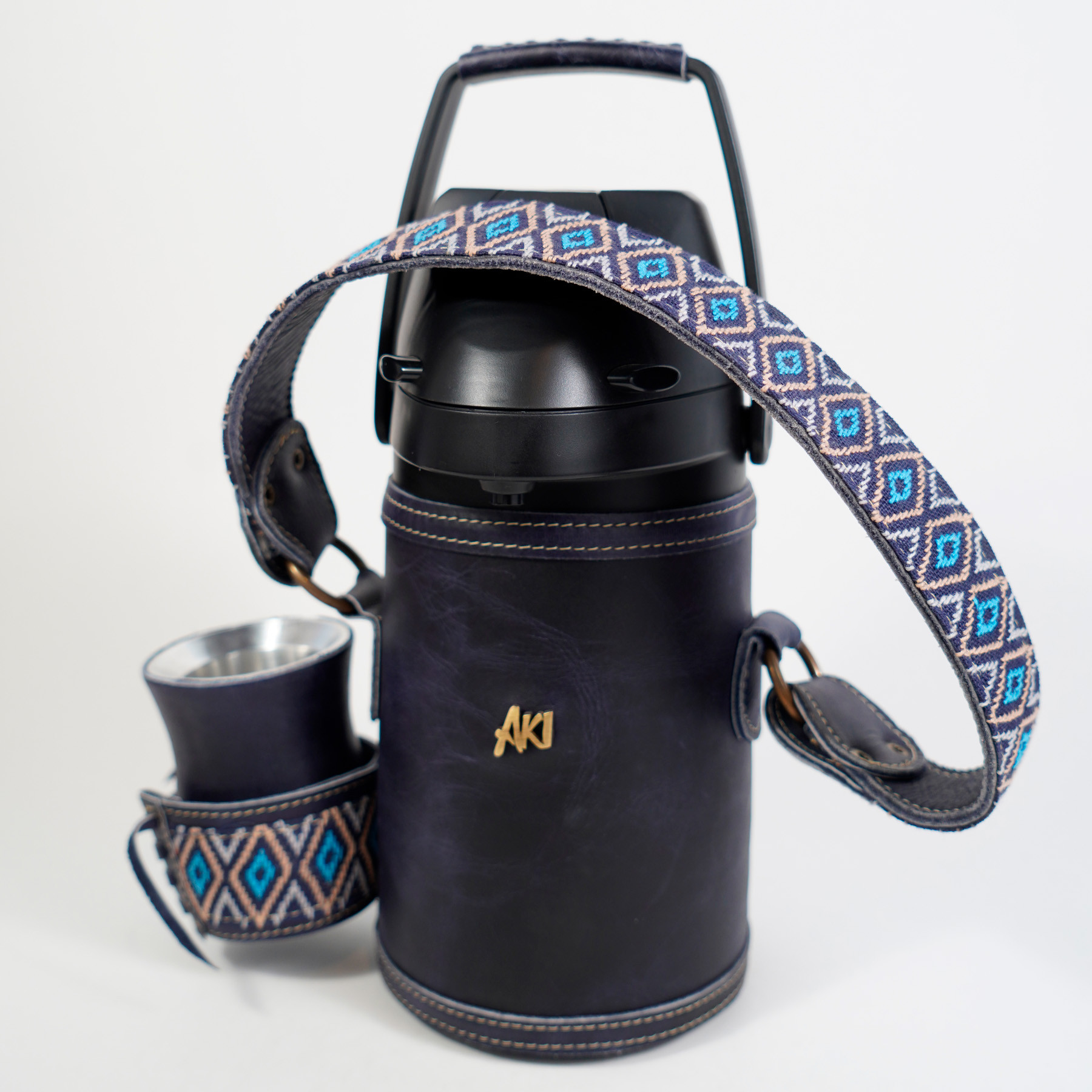 Termo de acero inoxidable forrado en cuero genuino textura lisa color azul marino gastado con detalle de ao poi. Mantiene agua fria, con capacidad de 1.3 litros, incluye guampa forrada en cuero. El terere es una bebida refrescante tradicional de Paraguay. El Ao Poi significa tela fina o prenda delicada, elaborada por artesanos en la ciudad de Mauricio José Troche.