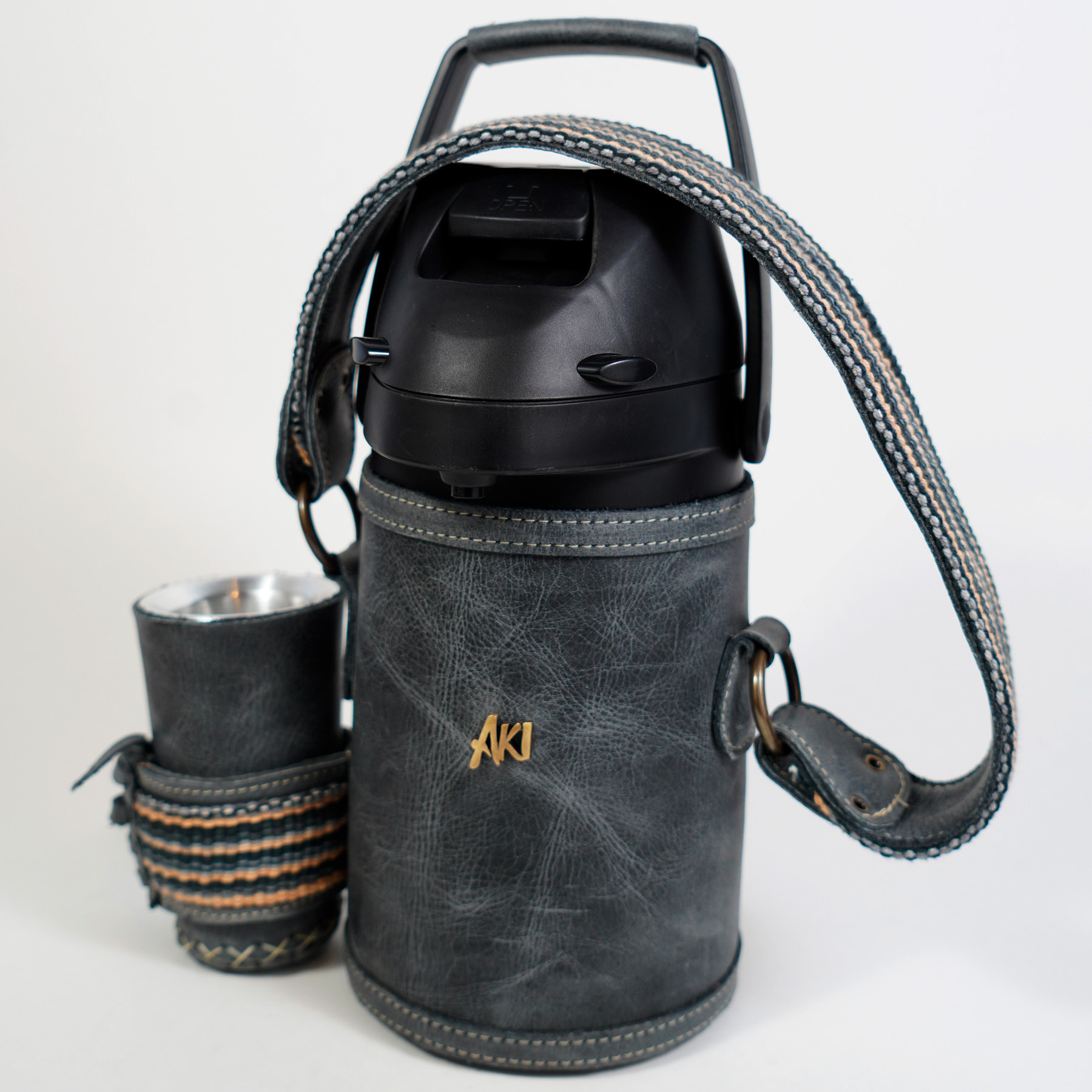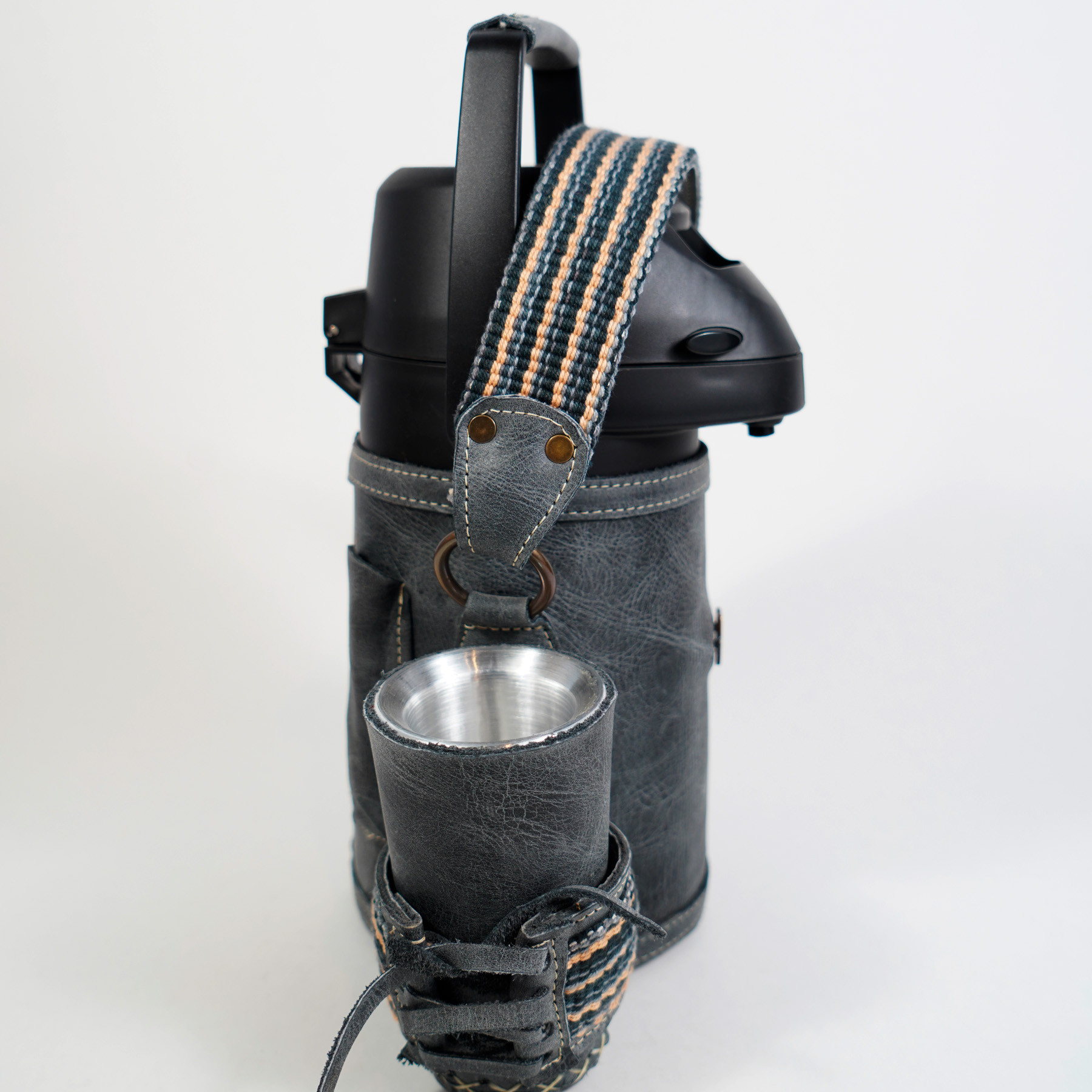 Termo de acero inoxidable forrado en cuero genuino textura lisa color negro gastado con detalle de faja. Mantiene agua fria, con capacidad de 1.3 litros, incluye guampa forrada en cuero. La faja es un tejido elaborado a mano por artesanos de Paraguay, mayormente e la ciudad de Carapegua y alrededores. El terere es una bebida refrescante tradicional de Paraguay.