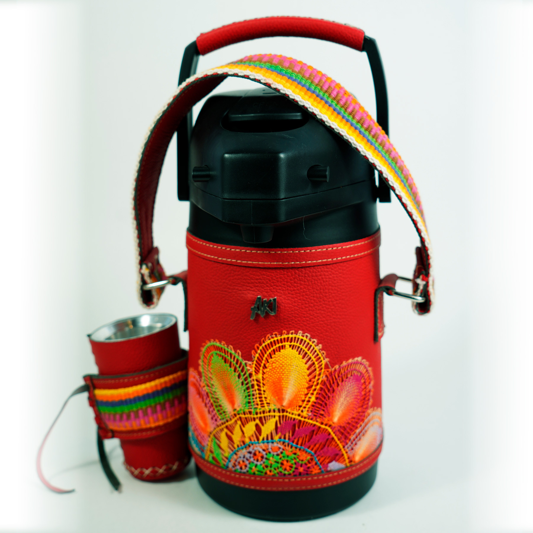 Termo de acero inoxidable forrado en cuero genuino textura graneada color rojo graneado detalle de faja y ñanduti.