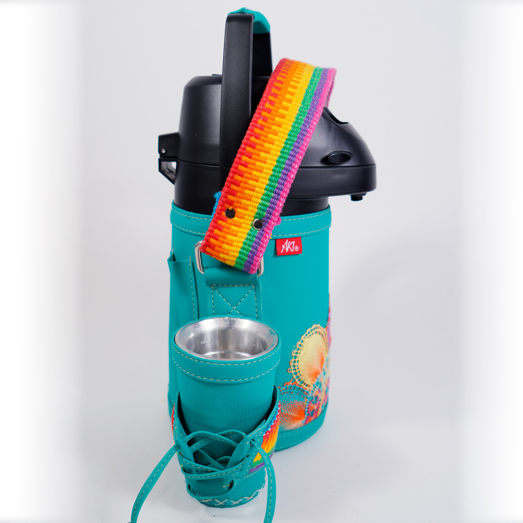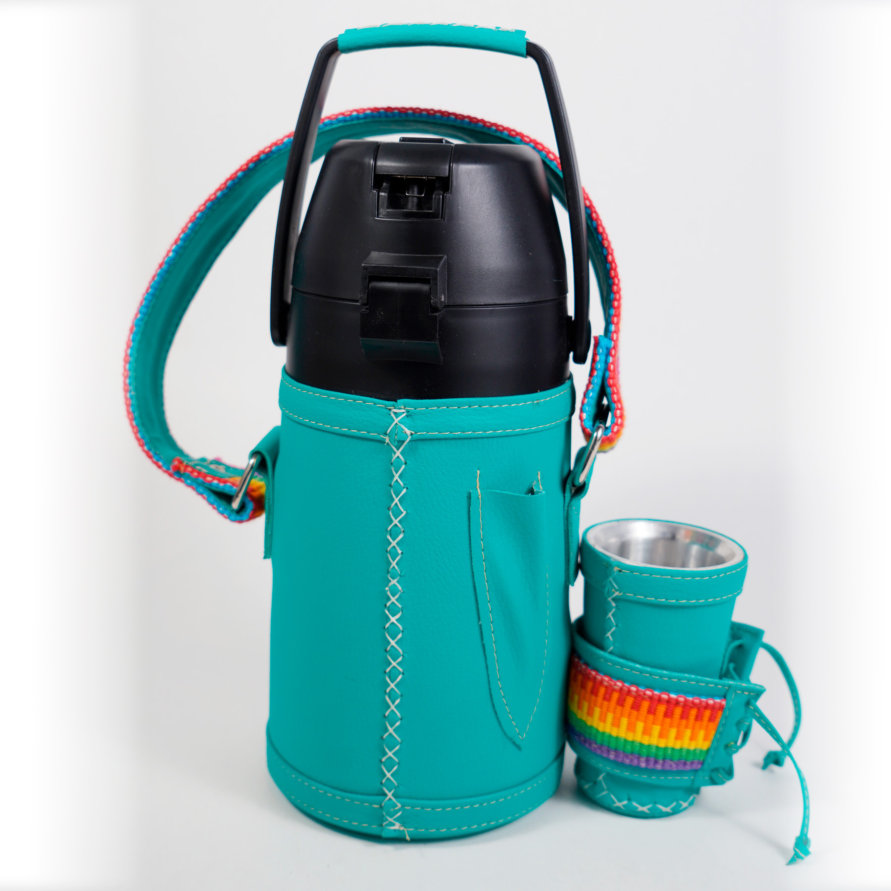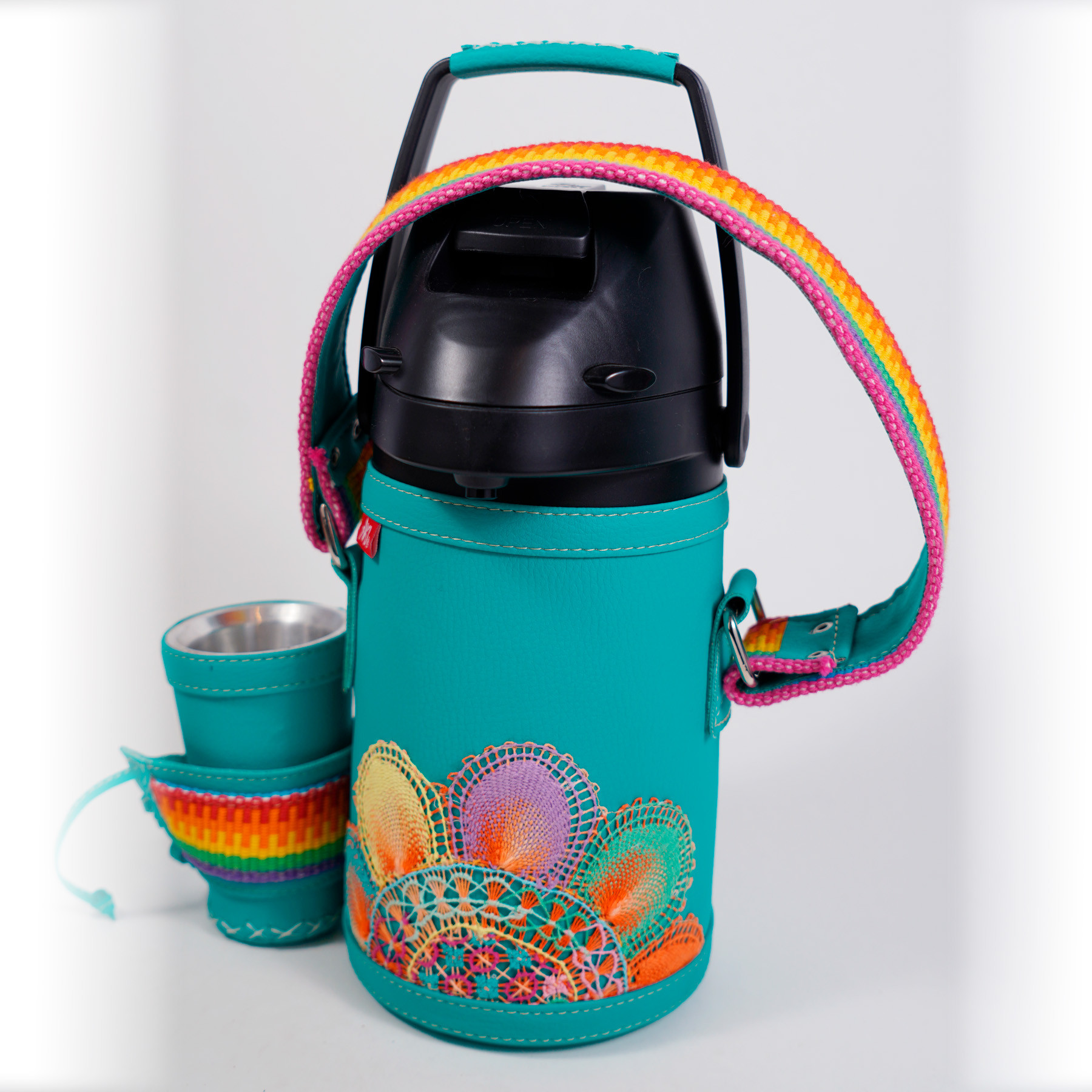 Termo de acero inoxidable forrado en simil cuero textura graneado color turquesa con detalle de faja y ñanduti. Mantiene agua fria, con capacidad de 1.3 litros, incluye guampa forrada en cuero.