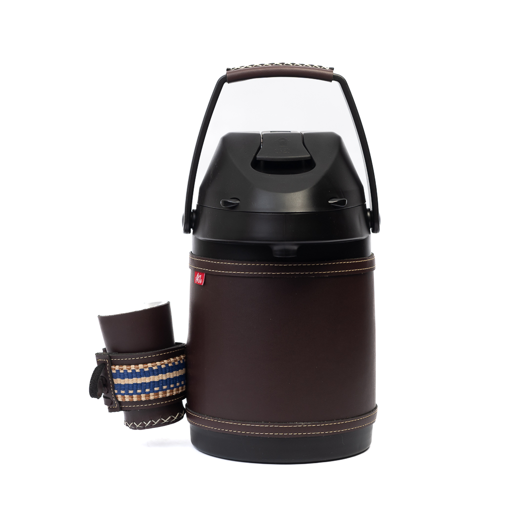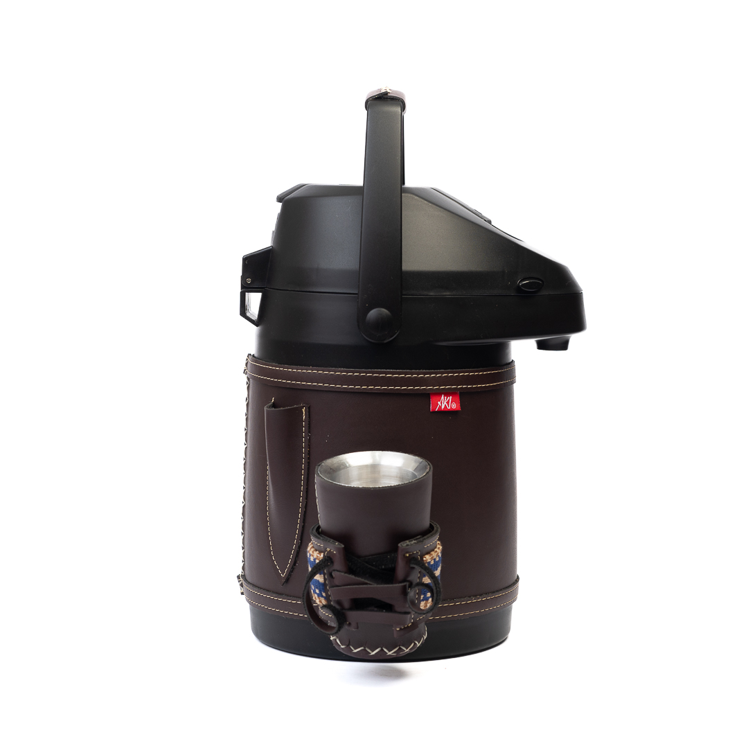 Termo Inox 2.5 L Tereré o Mate forrado en simil-cuero marron oscuro con faja