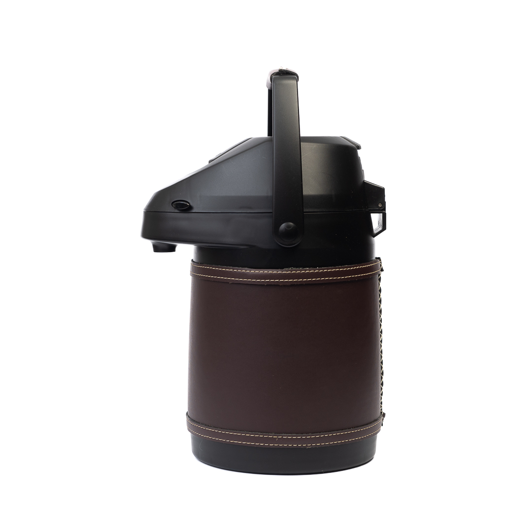 Termo Inox 2.5 L especial para tereré o mate, forrado en cuero marrón oscuro. Incluye detalles de faja. Diseño resistente y elegante y hecho a mano en Paraguay. Ideal para uso diario y regalos premium.