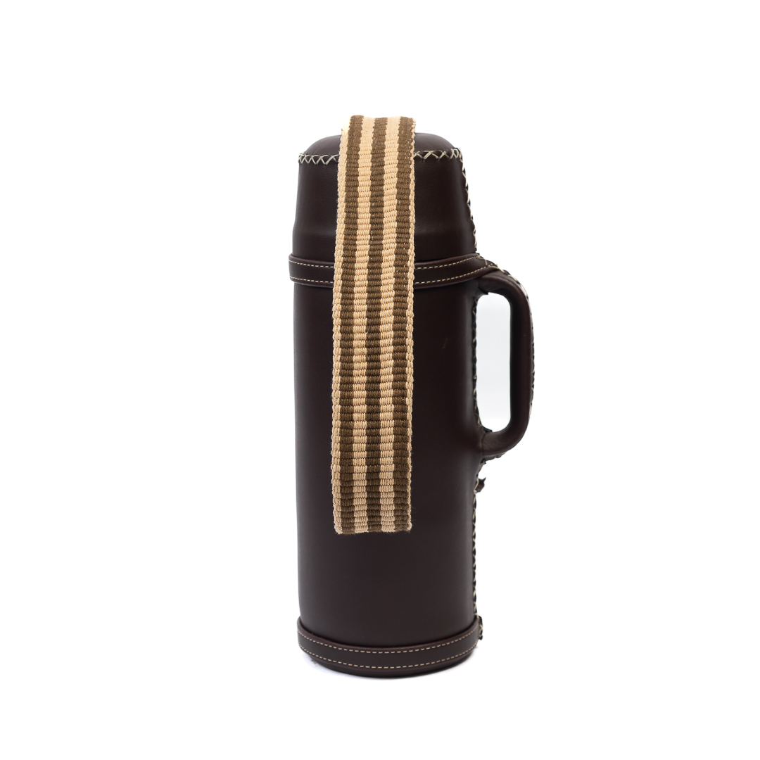 Termo especial para mate, forrado en cuero marrón oscuro. Incluye detalles de faja. Diseño resistente y elegante y hecho a mano en Paraguay. Ideal para uso diario y regalos premium.