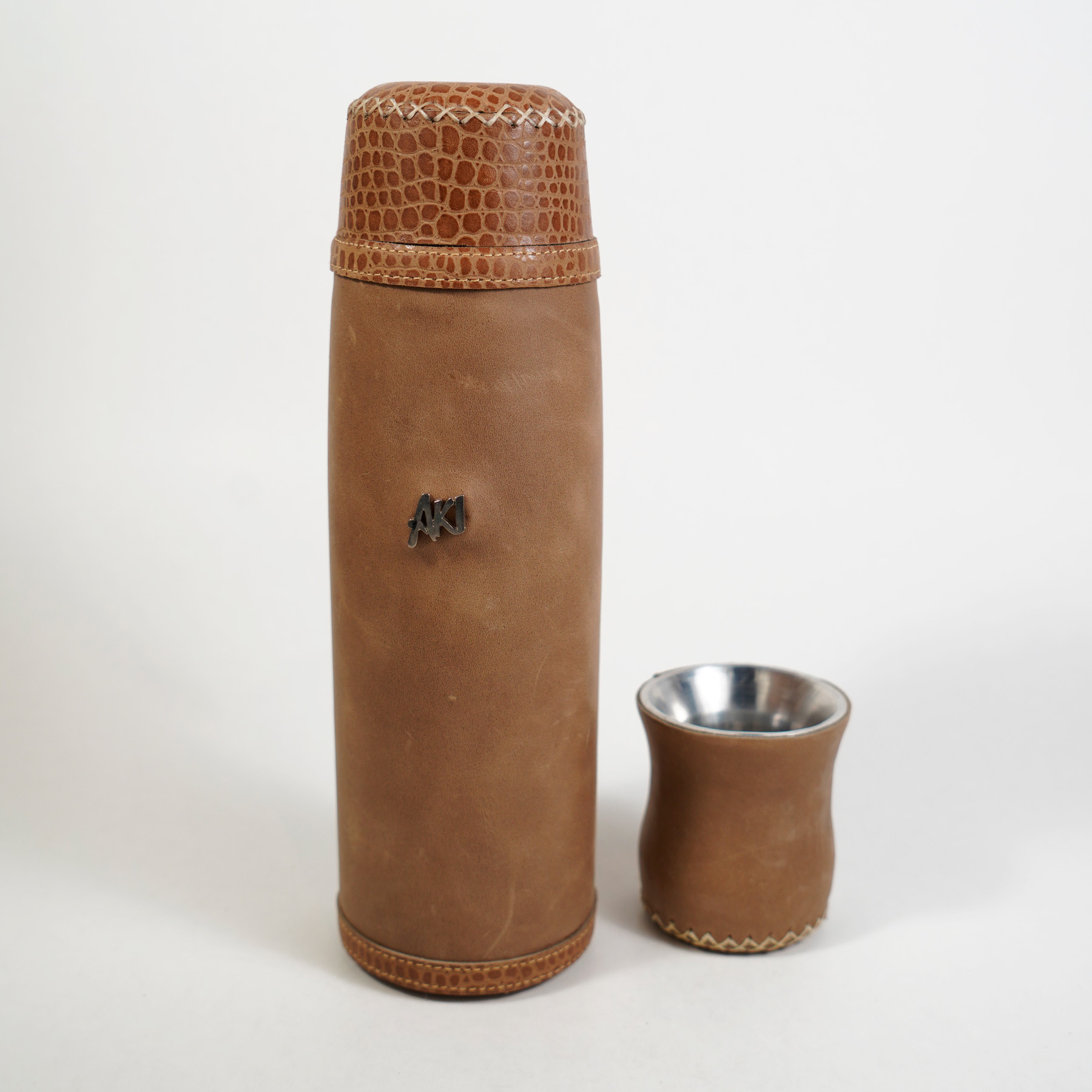 Termo Mate Inox En Cuero Color Marron Gastado Combinado Con Comodo Marron